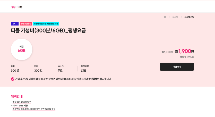 [티플러스] 가성비 300분/300건/6GB (1,900원)